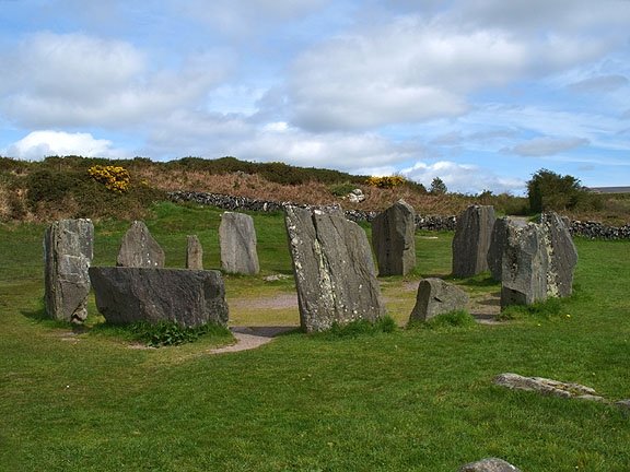The number of stones can vary between four and 60 purposely erected standing stones. The recumbent stone circle is found almost exclusively in North East Scotland. The recumbent stones themselves are almost always in the SW quadrant of the circle, and are aligned on the major moonrise. (Stone circles vary from henges such as Stonehenge, which have a ditch and/or bank of earth enclosing them.)