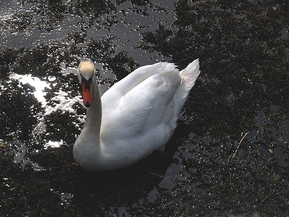 This looks like a swan swimming in an oil spill, but it's actually just swimming in water thick with seaweed and lit by the late afternoon sun.