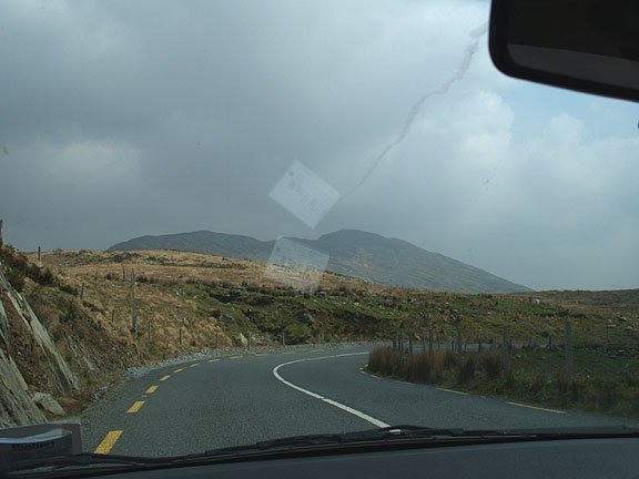 As we continued down the road we came down a grade with a huge valley expanse off the side of the road. Karlyn took a number of pictures while I drove, but none of them really turned out well. (The white squares reflected from the dash are parking permits.)