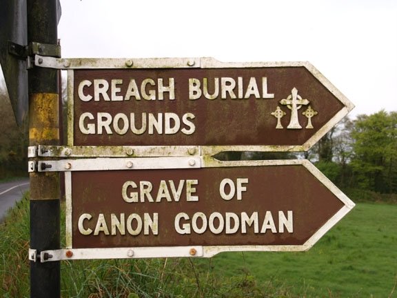 The road sign for the Creagh Cemetery. The Skibbereen/Baltimore road is on the left, and where the trees are on the right is the beginning of the road to Inish Beg.