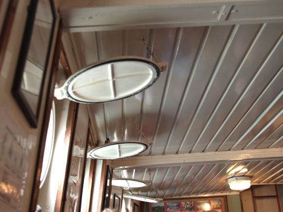 Inside the ferry, there were about 40-50 molded plastic seats. After everyone boarded and settled their belongings inside, most went back out on the deck for the balance of the 40-minute trip. This is a picture of the porthole covers in the passenger area. (If you turn the picture sideways, they look like toilet seats.)